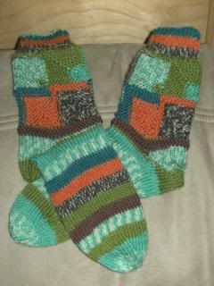 Schön dick sollten sie sein und schön bunt... Hmm. Bunt: Lana Grossa Meilenweit Merino. Dick: Das Ganze in 6-fach. Muster? Ich habe einfach mal gepatcht. Herausgekommen sind diese Socken in Gr. 38-39, ganz schön weich und warm. verbrauch: 89g.